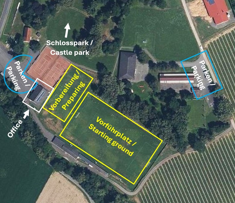 Achten Sie während der Bewerbe am Sportplatz darauf, dass sich Besucherhunde nicht direkt an der Abgrenzung zum Sportplatz aufhalten dürfen, und sich während der Bewerbe ruhig verhalten müssen (nicht bellen).